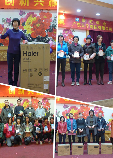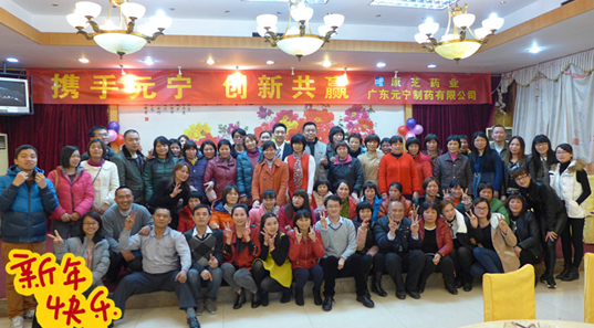 2月13日下午,廣東元寧制藥有限公司2014年度總結表彰大會暨2015年新春年會在碧翠湖酒家隆重舉行。年會以“攜手元寧、迎新共贏”為主題,分為總結表彰大會和聯歡會兩個環節。康芝藥業副董事長兼元寧制藥法人代表洪江濤先生、元寧制藥總經理徐建紅女士、元寧制藥廠長高宏生先生和元寧60多名員工歡聚一堂,辭舊迎新。