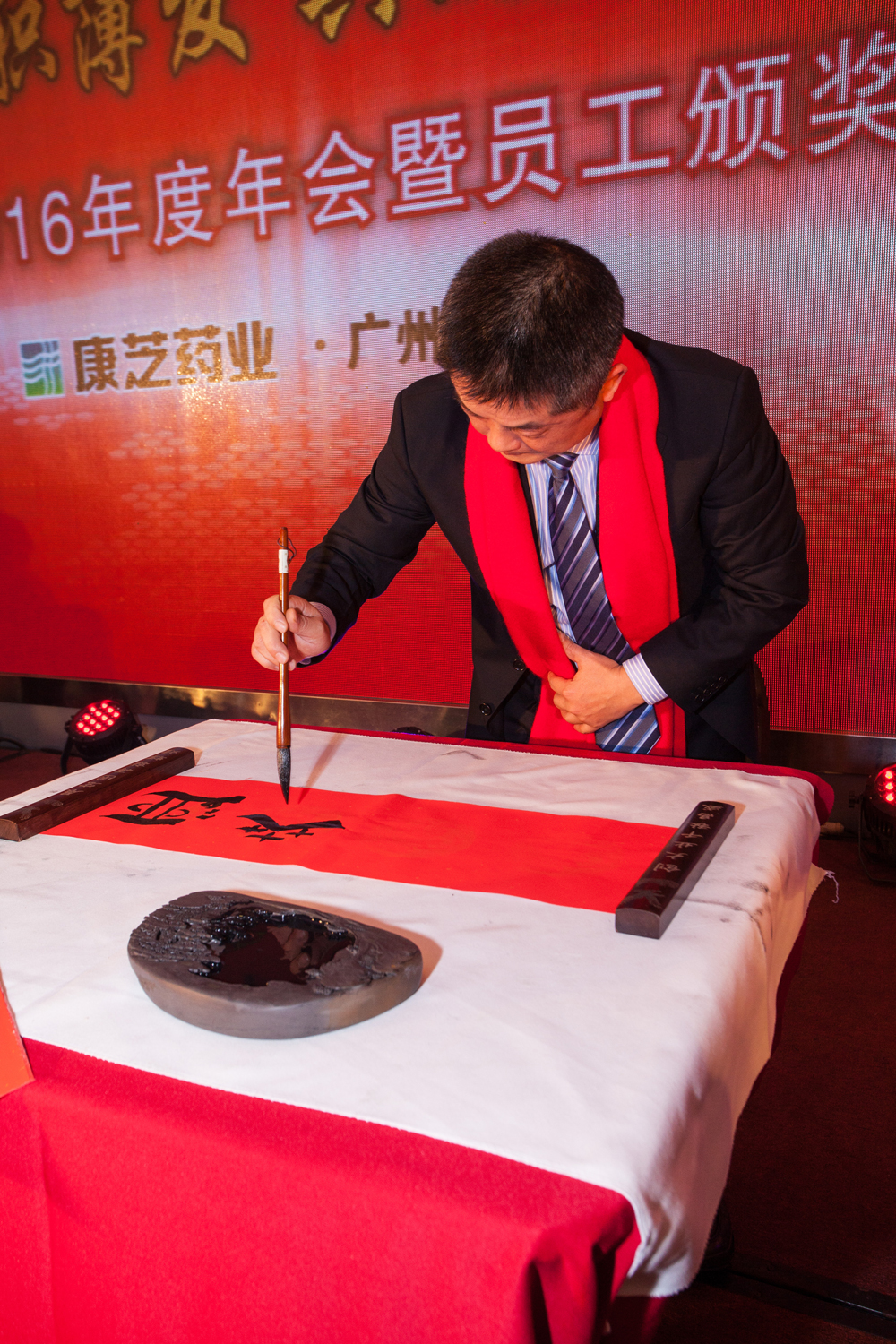 晚會(huì)上,除了精彩的水晶鼓和員工歌舞表演,董事長洪江游先生也大展歌喉,為大家獻(xiàn)唱一曲,將氣氛推向高潮。深情的演唱令員工們情緒高漲,接連上臺(tái)獻(xiàn)花。康芝藥業(yè)副總裁李幽泉先生也在悠揚(yáng)的古箏伴奏中,登臺(tái)獻(xiàn)上墨寶,將“福”字送給大家。