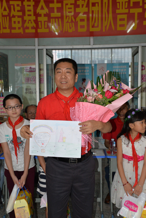 在捐贈儀式上,洪江游先生代表康芝紅臉蛋基金向軍屯小學贈送“愛心共建學校”牌匾,并為孩子們發放愛心大禮包。孩子們則向洪董事長獻上了鮮花和自己精心繪畫的美術作品。