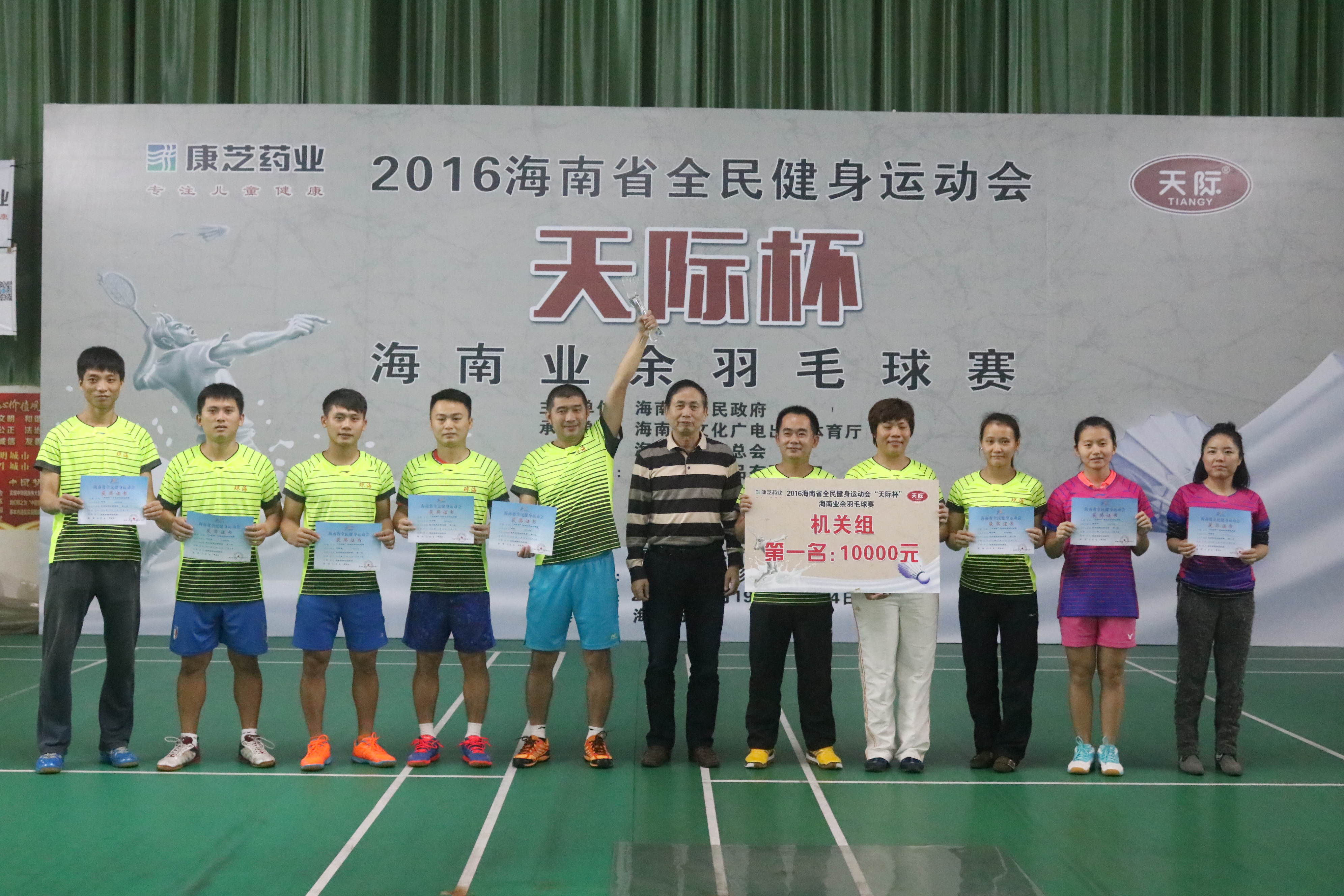 12月4日,由海南省人民政府主辦,海南省文化廣電出版體育廳、海南省體育總會承辦,康芝集團旗下天際食品冠名支持、康芝集團成員企業康芝藥業參與協辦的2016年海南省全民健身運動會“天際杯”海南業余羽毛球賽在海口圓滿閉幕。海南省文化廣電出版體育廳群眾體育處調研員劉勇,海南省體育總會主席陳亞俊、副主席兼秘書長葉志春、副主席王智勇,康芝集團工會主席何子群,康芝藥業品牌管理部總監方康莉、海南總廠辦公室主任周小欣等出席了閉幕儀式。