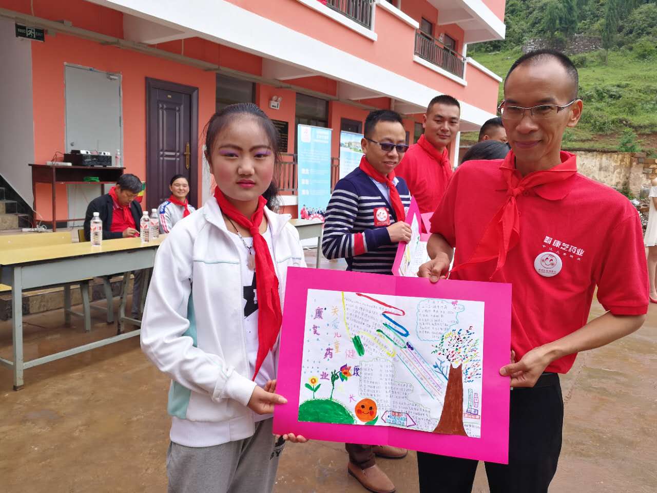 康芝藥業云南省區經理袁代松、康芝藥業云南合作伙伴曹喜勝,和來自云南銘俊藥業有限責任公司、云南彝頌文化傳播有限公司、富源縣旺家樂健康藥房的一眾愛心人士,以及云南曲靖市富源縣后所鎮中心學校肖松老師、阿依諾小學全體師生一同出席了捐贈儀式。