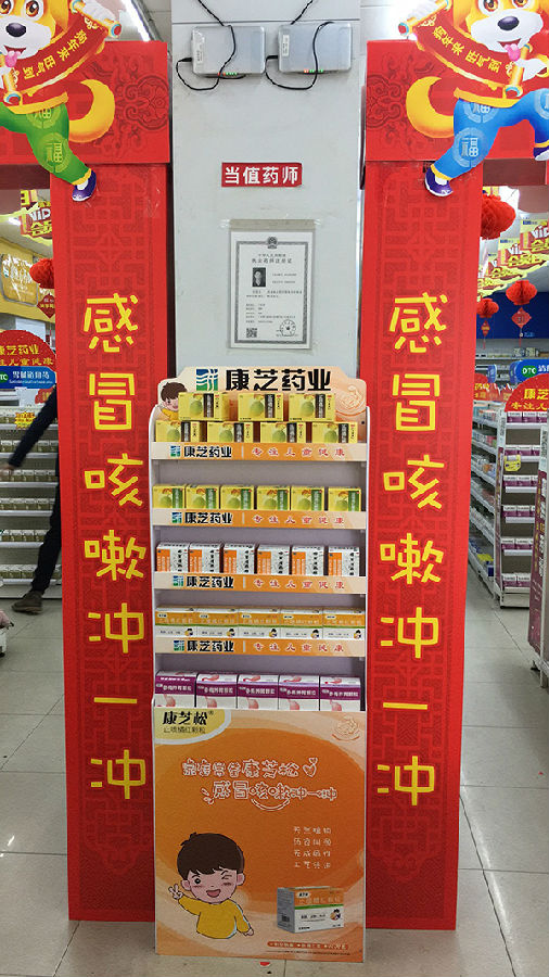 形象店的展示臺上,有序擺放著康芝松?止咳橘紅顆粒、度來林?鞣酸蛋白酵母散、金立爽?氨金黃敏顆粒等康芝兒藥系列產(chǎn)品。