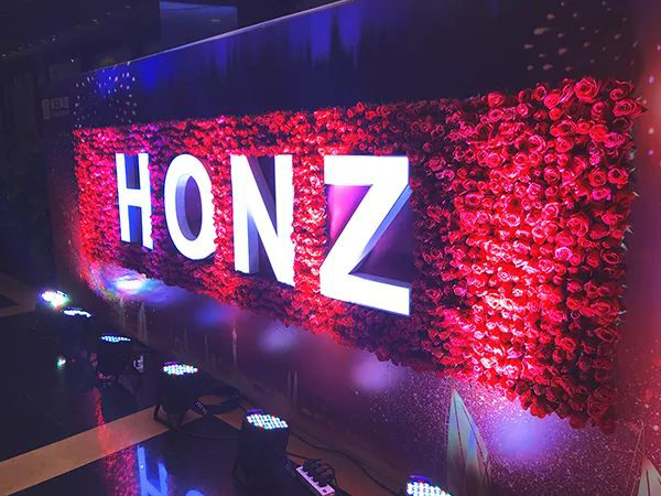 晚會景墻,鮮花群放,HONZ環繞其中,喜氣洋溢,歡迎八方來賓。