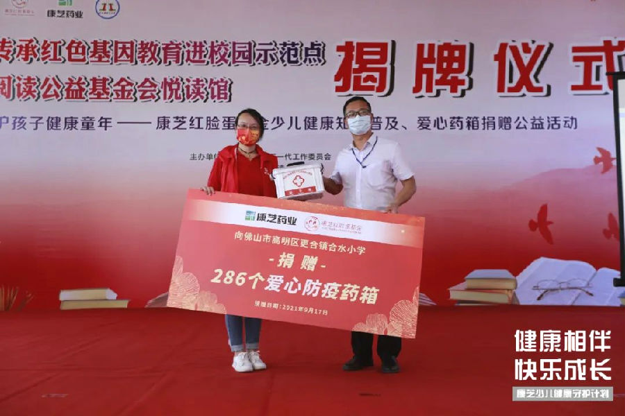 9月17日,中秋佳節來臨之際,由中國兒童少年基金會指導,康芝藥業、康芝紅臉蛋基金會主辦,廣東省南方閱讀公益基金會承辦的2021年度“康芝紅臉蛋基金少兒健康知識進校園暨愛心藥箱公益捐贈活動”第九站來到了高明區更合鎮合水小學。