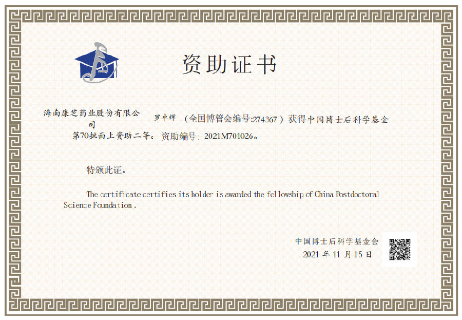 中國博士后科學基金由李政道先生倡議、鄧小平同志決策于1985年設立,是專門用于資助在站博士后科學研究的基金,旨在促使具有發(fā)展?jié)摿蛣?chuàng)新能力的優(yōu)秀博士后進行創(chuàng)新研究,培養(yǎng)造就一支跨學科、具有復合型和戰(zhàn)略性特點的博士后人才隊伍。據(jù)悉,本次面上資助海南省地區(qū)僅3項獲批,康芝藥業(yè)是唯一獲批的醫(yī)藥企業(yè)。