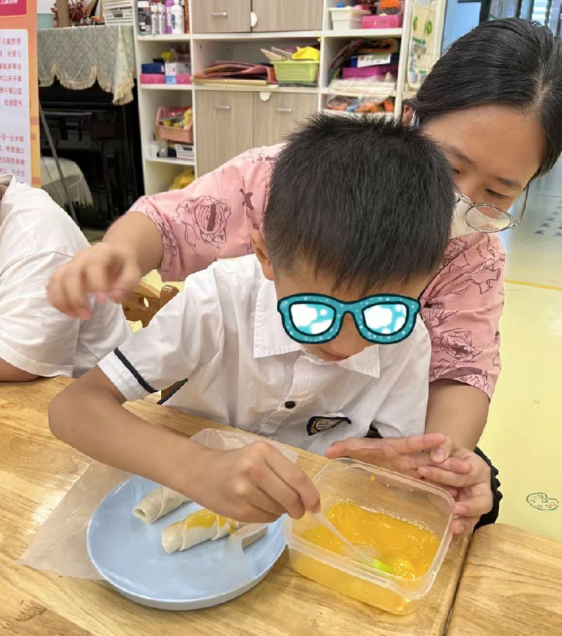 活動現場,來自康芝紅臉蛋基金和廣州市心友心智障礙者服務協會的志愿者們手把手教20名自閉癥兒童動手制作香腸面包。志愿者首先為孩子們準備好制作香腸面包的材料及工具,并認真地介紹了制作面包的流程,而孩子們天生充滿了好奇心,在志愿者講解的過程中,就已經迫不及待開始大展身手了。