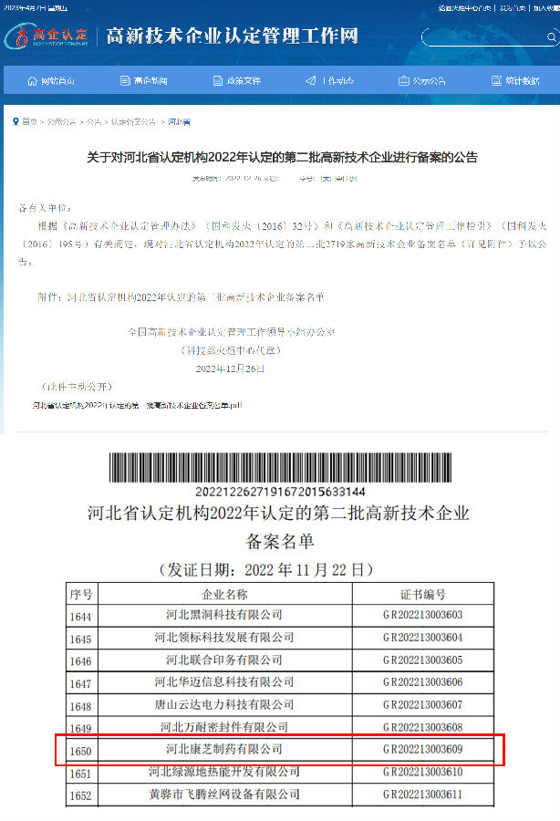 近日,全國(guó)高新技術(shù)企業(yè)認(rèn)定管理工作領(lǐng)導(dǎo)小組辦公室批復(fù)了河北省2022年高新技術(shù)企業(yè)認(rèn)定名單,康芝藥業(yè)旗下子公司河北康芝制藥有限公司憑借著專業(yè)實(shí)力及創(chuàng)新能力,成功通過(guò)河北省“高新技術(shù)企業(yè)”認(rèn)定。