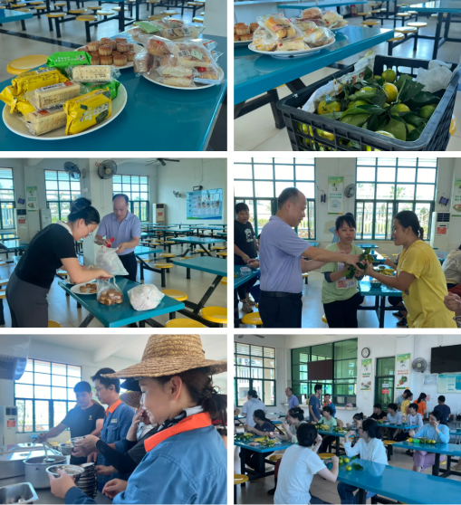 工會(huì)還在飯?zhí)镁臏?zhǔn)備了點(diǎn)心、鮮果、防暑藥品等物資,并提前開啟食堂通風(fēng)與制冷設(shè)備進(jìn)行室內(nèi)降溫,確保員工們?cè)谛菹r(shí)刻能感受到家的溫暖。當(dāng)員工們疲憊歸來,眼前溫馨的一幕令他們十分感動(dòng),臉上洋溢著感激的笑容。工會(huì)主席向大家分發(fā)橘子和點(diǎn)心,并表達(dá)了誠摯的關(guān)懷:“所有在酷暑中辛勤工作的員工們辛苦了,愿這份小小的關(guān)懷,能讓大家感受到溫暖。”康芝藥業(yè)海南區(qū)工會(huì)以實(shí)際行動(dòng)詮釋了本次康芝藥業(yè)海南生產(chǎn)基地復(fù)工復(fù)產(chǎn)工作的力量、速度與溫情。