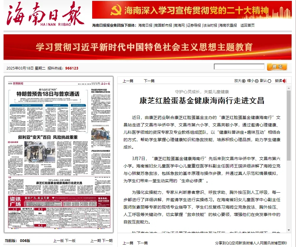 少年強,則國強。為認真貫徹黨的二十大精神,積極響應(yīng)教育部等十七部門聯(lián)合印發(fā)的《全面加強和改進新時代學(xué)生心理健康工作專項行動計劃(2023—2025年)》,助推海南省人民政府關(guān)于《海南省兒童發(fā)展規(guī)劃(2021—2030年)》等文件精神的落實,近日,由康芝藥業(yè)聯(lián)合康芝紅臉蛋基金主辦的“康芝紅臉蛋基金健康海南行”文昌站走進了文昌市華僑中學(xué)、文昌市第六小學(xué)、文昌英敏小學(xué)。活動引發(fā)熱烈的社會反響,不僅收獲師生的一致好評,還得到海南日報、中華網(wǎng)、鳳凰新聞、新華報業(yè)網(wǎng)等知名媒體的報道及轉(zhuǎn)發(fā)。